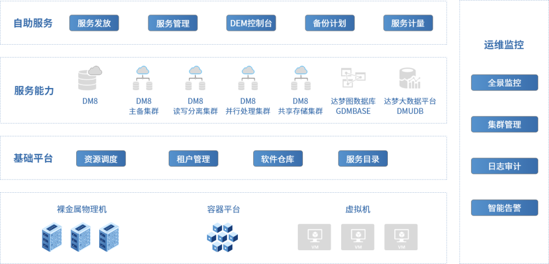达梦启云数据库云服务系统,集数据存储、备份、计算、管理、运维、监控、安全等功能为一体,能够为用户提供“按需申请、开箱即用、秒级发放”的数据库服务系统,是在各种云场景下统一发放、回收、管理、监控云数据库服务的有力工具。