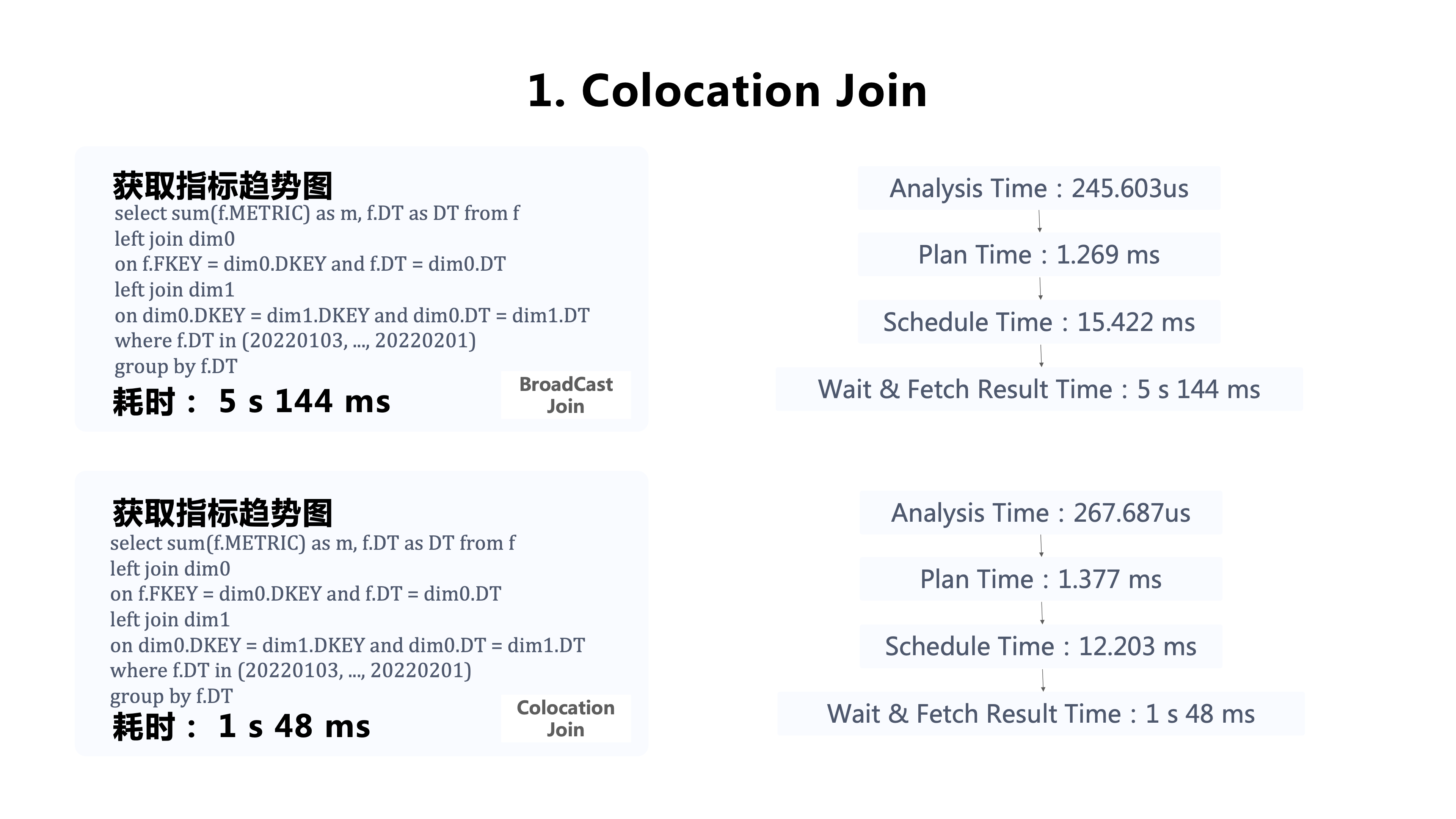 我们将 SQL 查询执行时间进行了统计,如上图所示在采取方案一 Colocation Join 的方式时,查询响应时间从之前的 5 秒提升至 1 秒。虽然查询效率有所提升,但是我们希望能够更进一步缩短响应时间,完成预期目标。在采用方案二来调整数据模型后,SQL 执行时间从原来的 5 秒达到 63 毫秒响应时间,查询响应时间得到显著提升,满足我们对查询响应毫秒级的目标。