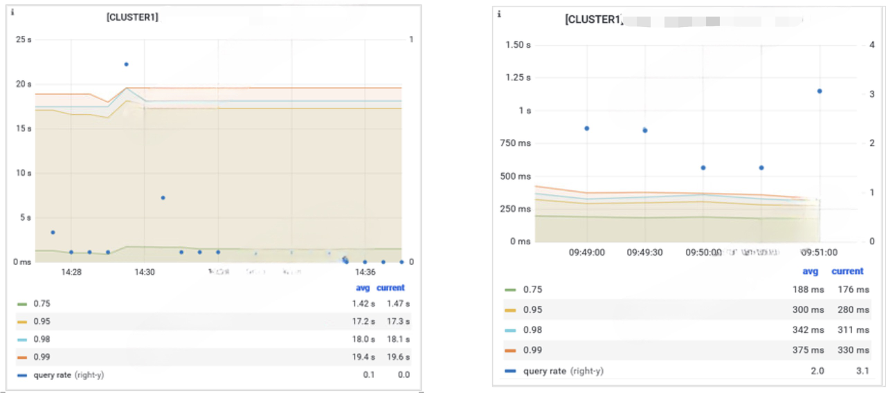 同时,我们借助 Grafana 查看 Apache Doris 查询性能,发现宽表构建的方案能够使查询时间从原来的十多秒缩短至百毫秒内,服务器也不再出现抖动的情况。