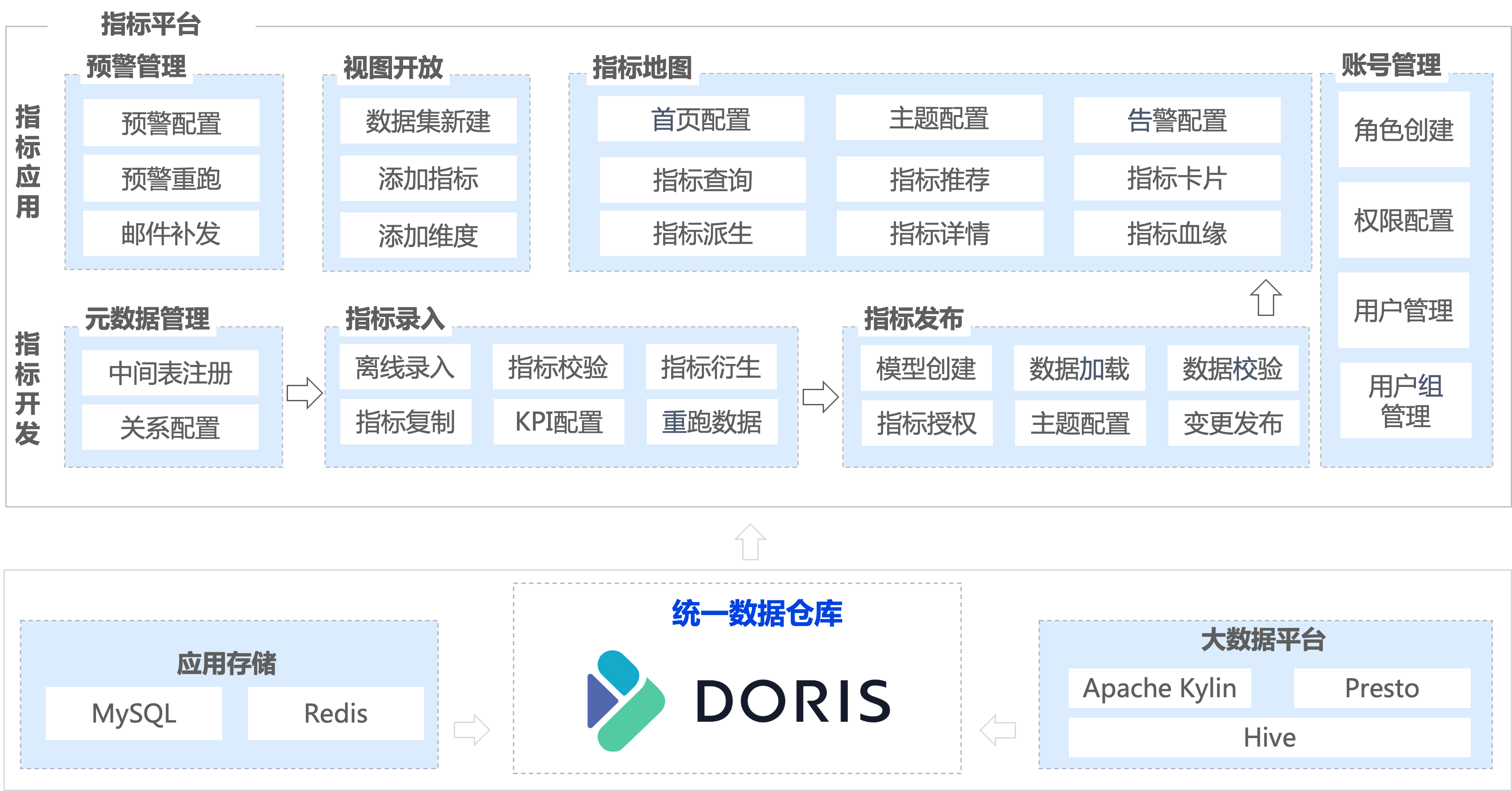 指标平台的功能实现主要依赖于 Apache Doris 数仓架构的支持,整体指标线上流程基于开发和业务配合完成。开发人员首先统一在平台进行元数据管理和指标录入,包括对加工报表的底表进行注册,配置中间表的数据粒度和更新频率等,接着对表进行关联、录入指标名称和指标口径信息。在输入指标基础信息之后,交由业务人员负责,选择对指标分析所需维度,对指标进行发布。