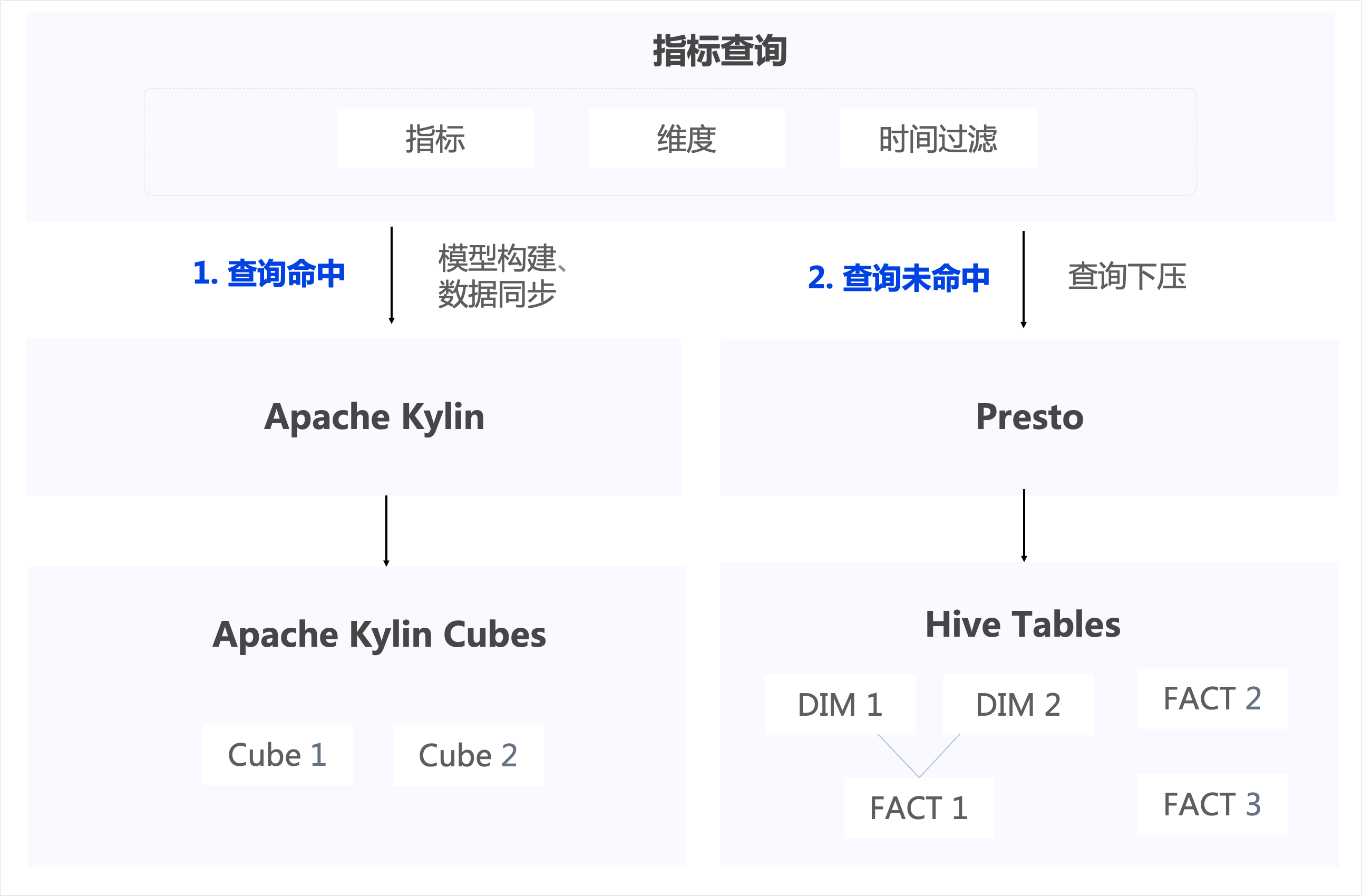 - 查询性能: 当查询字段未命中 Cube 时,需要下压至 Presto。而 Presto 的查询性能得不到保障,特别是在查询码值的场景下,会遇到查询超时的现象,阻碍指标发布。