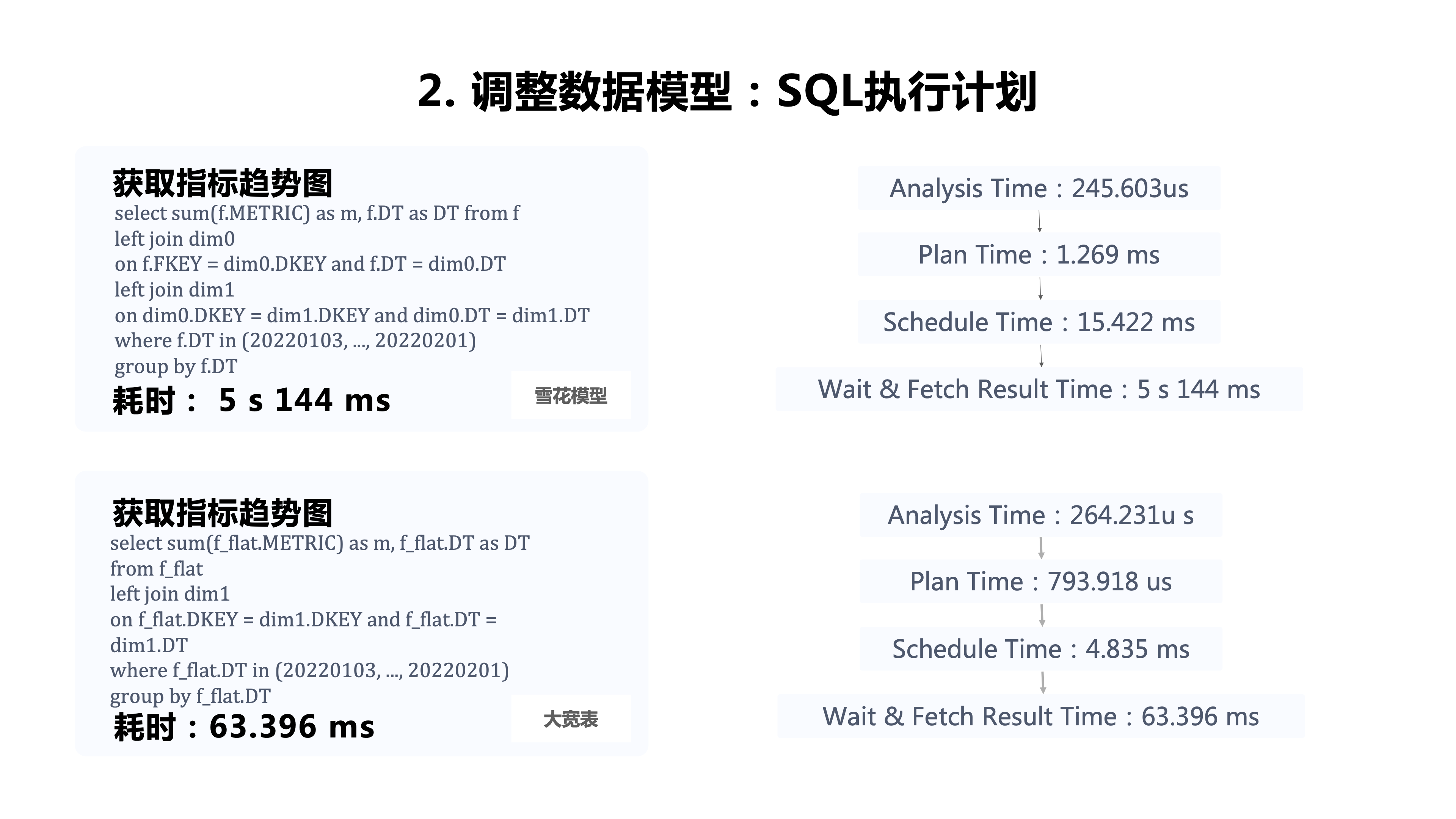 在准备工作完成后即可开始进行大表关联查询,我们选择了耗时较长的 SQL 来查询指标趋势图。基于毫秒级查询目标,我们实施了两个优化解决方案。第一个方案是利用 Colocation Join 将数据在建表时提前聚合。第二个方案是借助 Audit Loader 的方式收集高频 SQL,反向优化数仓的表构建以及改写 SQL,使用偏宽表设计代替之前的星型 / 雪花模型。通过两个方案的测试与评估,我们发现第二个方案能够在查询响应、服务资源节省中达到更加显著的收益。