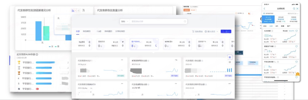 - 派生指标:为了满足复杂的指标分析场景,基于原子指标,添加过滤条件或者结合其他指标进行运算,帮助用户自助配置看板,节省取数过程。例如用户希望生成客均 AUM 余额进行分析,平台可以借助原子指标 AUM 余额与全量客户数生成该指标。