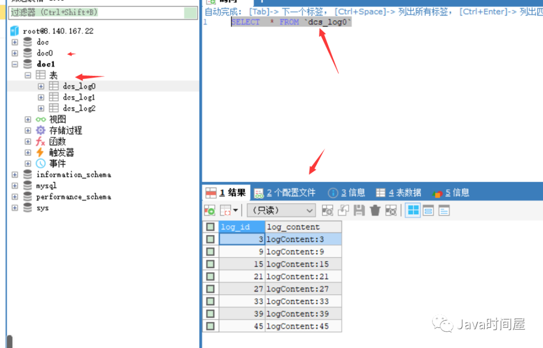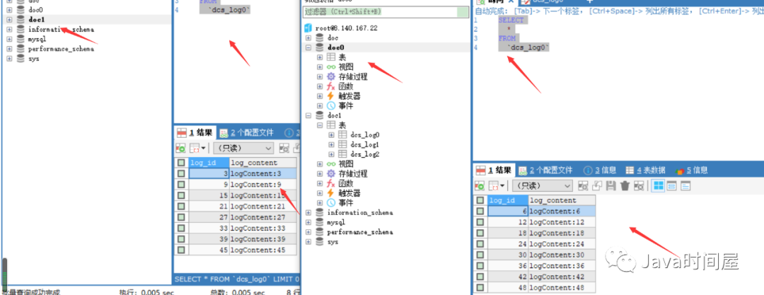因为就两个字段,非常的简单,这个就是按照上面的分库、分表的逻辑创建的数据库表,对应的两个库和三个表,相当于分片成了6份进行存储,已经能够满足大部分的扩容、高并发的需求。