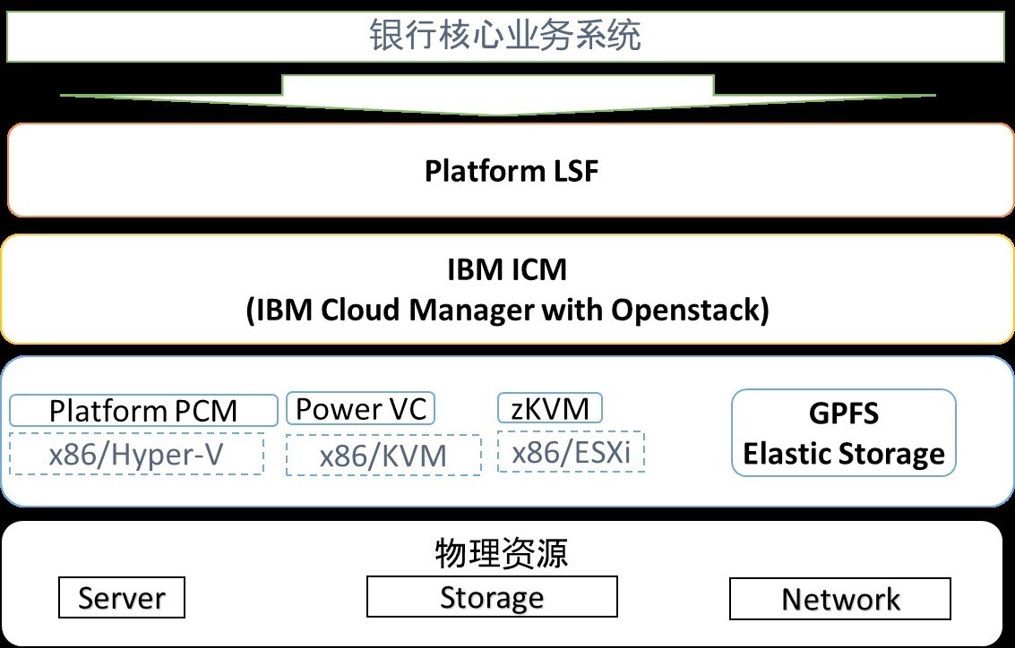 - IBM管理基础设施的软件主要有:PCM,管理baremetal,帮助用户对逻辑进行部署。PowerVC和zKVM提供虚拟化服务,GPFS提供弹性存储服务。
