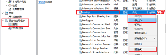 通过右键选择启动或停止进行MySQL服务的控制,另外也可以点击属性选项进行MySQL服务开机自动或手动启动的控制。
