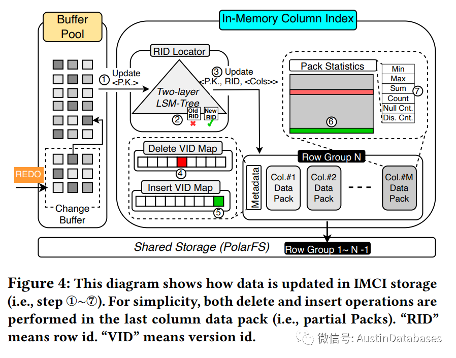 如图4所示,PolarDB-IMCI中的列索引作为现有行存储的补充存储。在PolarDB-IMCI中,表的列可以选择地参与列索引。PolarDB-IMCI将表的所有行分为多个行组,并进行追加式写入以提高写入性能。在行组中,数据的每一列都与一些统计元数据一起组织成数据包。为了提供快照隔离,每个行组都包含一个插入版本ID(VID)映射和一个删除版本ID映射来控制并发事务处理的可见性。由于行组是追加式的,因此删除操作需要显式提供给定主键的行ID以设置该行的删除版本。为此,PolarDB-IMCI实现了一个行ID定位器(即两层LSM树)来将主键映射到列索引中行的物理位置。