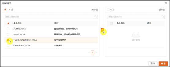 您也可以通过选中右边列表中的已选权限,然后点击 < 和确定按钮来撤回对角色的权限分配。