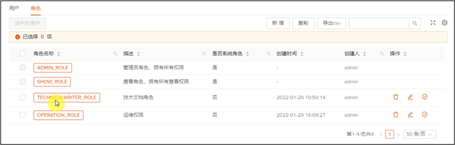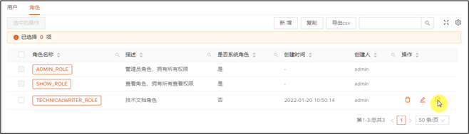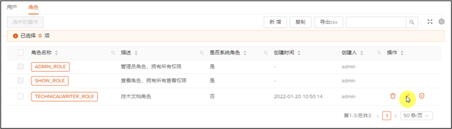 1、 点击角色TECHNICALWRITER_ROLE最后操作列中的删除图标。