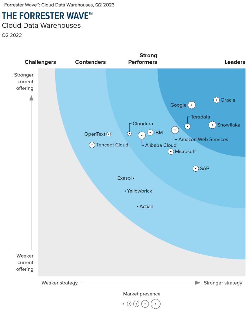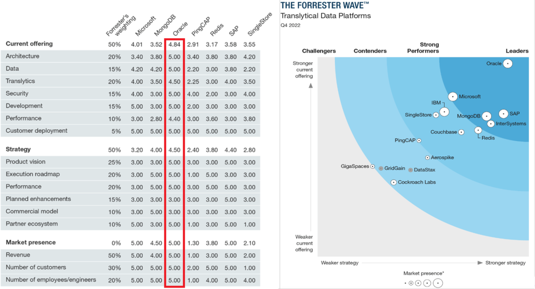 Oracle数据库诞生至今,一直作为业界领先的数据处理平台而存在。在近期的Forrester Wave数据平台分析中,更是绝对的领导者:Oracle ADB在所有维度都排名领先,在15个项目中有13项获得了满分。