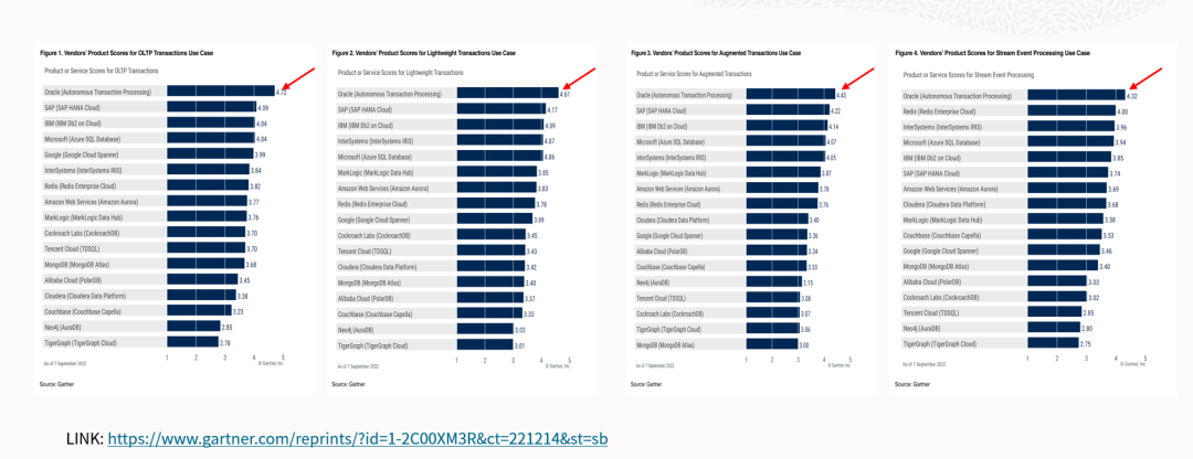 同时,在Gartner的分析报告中,Oracle已经连续4年在交易型云数据库关键用例排名领先。