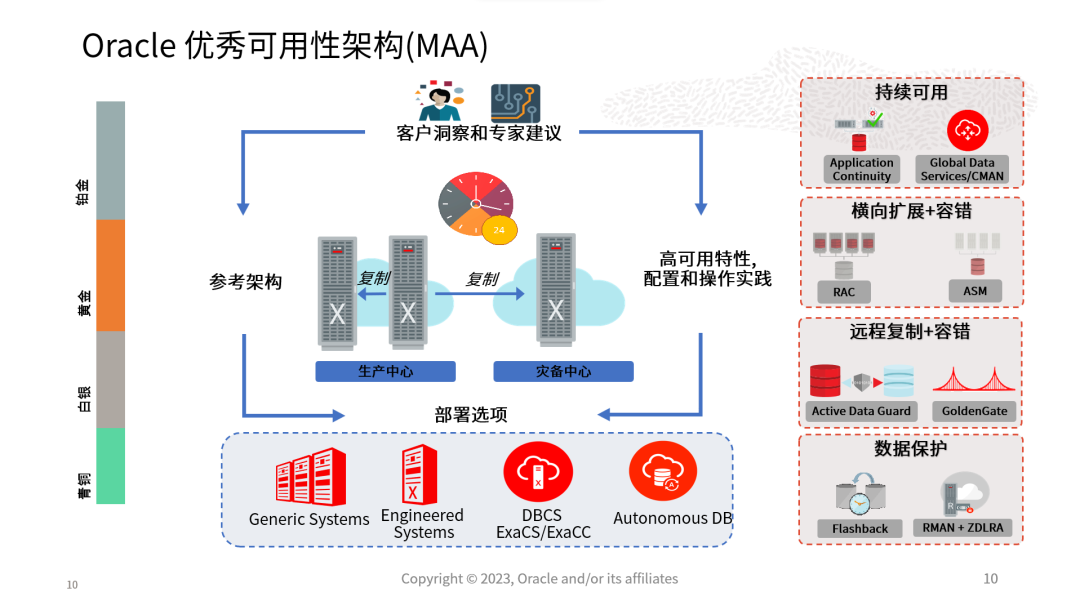 Oracle的MAA(Maximum Availability Architecture)架构提供了全面的保障能力,从上层的应用透明业务连续性到底层的数据保护和容错。这个架构能够有效地避免各种意外情况和计划内的维护对应用的负面影响。举例来说,通过使用AC/TAC,即使在计算部件级别发生故障或计划内维护时,应用也能够无感知地继续运行。采用RAC可以实现数据库计算能力的应用透明横向扩展,并提供计算节点的冗余。GI的ASM组件能够实现存储能力的横向扩展和容错。通过ADG实现数据库的复制和容错自动修复。Flashback和RMAN+ZDLRA提供了核心数据库的最后一道防线,防止人为误操作或包括勒索病毒在内的恶意破坏,避免损失。