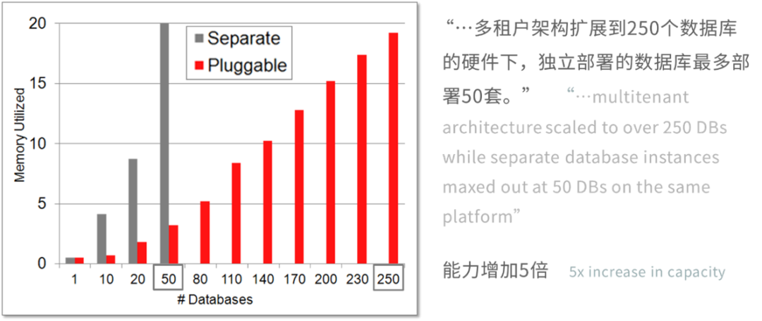 Oracle 12.1就已经推出的多租户架构,在保持与原有非多租户架构的应用透明兼容性的基础上,可以在相同的硬件配置下整合更多的数据库到一个平台中。这样的架构极大地提高了系统的利用率,并通过整合数据库大幅降低了运维成本。