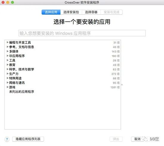 在CrossOver安装程序中包含很多种Windows应用,其中包含办公软件、游戏软件、多媒体软件、网络类软件等等,这些都是平时常用到的应用程序。当我们在Mac上安装CrossOver之后,在安装Windows应用程序的界面中,列出了十多项分类,展开后会看到里面包含了很多软件,所以若你想要实现在Mac上使用Windows应用程序,通过这款软件安装便可以实现。