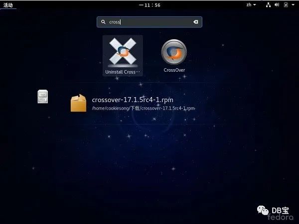 5、点击“活动”,在搜索框中输入“CrossOver”,然后安装好的软件就会显示出来,点击打开;