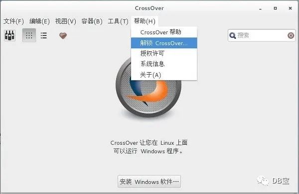 2、运行已经安装好的CrossOver Linux,在【帮助】中找到【解锁CrossOver】;