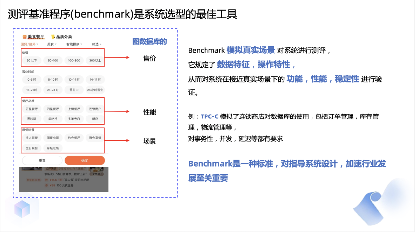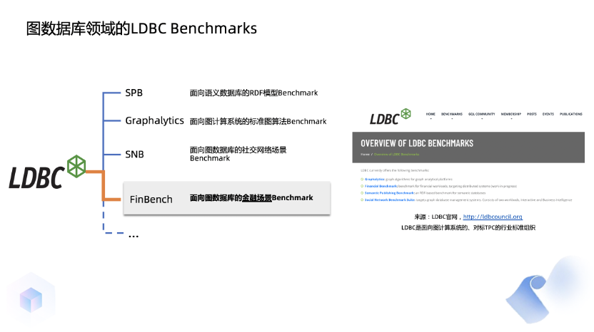 今天想与大家分享的是我们最近进行的一项工作,即LDBC-FinBench,首个金融图数据库测试基准。首先,我想介绍一下测试基准是什么。就像我们购买东西一样,我们需要一些衡量指标来评估其价格是否合理。同样地,在购买数据库时,我们也需要一套标准来进行测试和评估。因此,在关系数据库中,我们有一些著名的测试基准,如TPC-C和TPC-H。然而,在图数据库这个相对较新的数据库领域,缺乏相应的测试基准。而蚂蚁正好在金融图数据库应用方面有着丰富的经验。因此,我们希望通过我们自己的实践经验,提取出一些东西,制定一套可以帮助金融机构评估图数据库性能的标准。这就是我们创建FinBench的初衷。图数据库仍然是相对较新的技术,缺乏统一的标准。与关系数据库不同,图数据库的查询语言目前还没有国际标准。ISO组织正在制定这样一个标准,蚂蚁也参与其中并提出了一些建议。但这个标准预计在今年年底左右才会发布第一个版本。因此,目前在查询语言领域,每个数据库都有自己的一套规则,这给客户带来了很大的困扰。客户今天选择了一种图数据库,明天又选择另一种,就需要学习不同的查询语言,这增加了成本。另外,目前在图数据库领域,我们也面临着图模型的多样性,比如最常用的是RDF和属性图模型。还有管理功能,这些差异更加显著。几乎每个数据库都有自己独特的特点。因此,我们意识到对于外部客户来说,选择图数据库非常困难,因为每个图数据库的差异都太大,缺乏一个客观、准确的比较方式。为了选择一个东西,我们总是需要一些标准,这是一个比较的基础,你可以根据这些指标来评估它的好坏。对于数据库来说,我们也会关注一系列的指标,当然我们可能更关注其中某一部分指标,并根据这些指标来评估数据库。在关系数据库中,我们已经有了一些标准,如TPC-C和TPC-H。这些标准是如何制定的呢?基本上是基于假设的使用场景,模拟在这些场景下用户对数据库的一系列要求,然后看数据库在运行过程中对这些要求的满足程度。以TPC-C为例,它模拟了一个包含多个仓库的零售体系。比如沃尔玛等连锁超市,它们有许多个仓库,需要一个统一的数据库来管理库存、订货和销售等指标。最终评价的指标就是,这个数据库上包括硬件、软件等,花多少钱能达到什么样的性能,然后把性能除以价格,得到了一个性价比。TPC-C基本上模拟了这样一个业务场景。