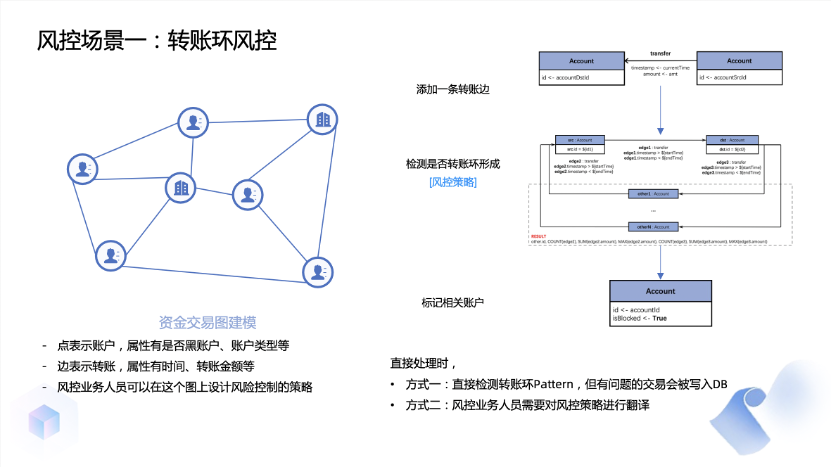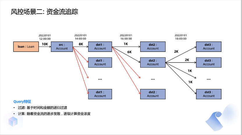 在关系数据库领域,大家通常会提到 TPC这个组织,它制定了包括TPC-C,TPC-H在内的一系列测试基准。而在图数据库领域,LDBC(Linked Data Benchmark Council)是被广泛认可的组织。LDBC的成员包括蚂蚁集团,Oracle、微软、Facebook、Google等大公司,它们都在开发图数据库,并共同制定标准。在LDBC组织中,已有几个测试基准,如SPB (Semantic Publishing Benchmark) ,SNB(Social Network Benchmark)等。其中SNB是目前使用最广的一个测试基准,但它偏向社交场景。我们发现金融领域的数据和模式与社交网络有很大的不同。因此,直接使用社交网络的测试基准来评估数据库无法准确反映金融领域的表现。因此,我们决定带头创建一个新的测试标准,称之为FinBench(Financial Benchmark)。我们在LDBC框架下进行工作,并组建了一个由九家公司组成的工作小组。在最近的数据库大会SIGMOD 2023上,我们发布了这个标准的第一个版本,并将持续迭代和丰富它,以使其更加准确和全面。今天,我简单向大家介绍下这个benchmark设计相关的内容。FinBench模拟了金融风控领域的一些应用场景。目前,我们有几类数据,包括公司、账户、贷款和设备(手机或电脑)。在风控领域,这些信息非常重要。接下来,我将简要介绍两个查询,实际上我们在FinBench中有十几个不同的查询和写入操作。第一个是关于环检测的场景。在这个场景中,我们要找出一笔新增交易是否会使图上构成一个环。当然,并不是所有的环都是不好的,它们需要满足一定的过滤条件。例如,环上的边必须在某个时间段内发生。比如你不能说去年的一笔交易与今年形成了环,然后就认为是黑灰产,因为它还有其他属性上的要求。对于环检测,我们还有一个规定,即当我要转账时,我要决定是否允许这张账户进行转账。如果发现这笔交易会构成一个欺诈环,那么我就不应该让它通过,那么这条新的边也就不应该存在。这就形成了一个所谓的读写查询,先读后写的查询。如果发现是一个环,就不写入这条边;如果不构成环,那么这个边就是好的,我应该将其写入。举个简单的例子,支付平台会向用户发送优惠券,而黑灰产用户会通过虚构交易来将优惠券中的钱套现出来。这就是通过环检测来实现的,所以在金融领域,环检测是非常常见的模式。第二个例子是资金流的追踪,这在金融领域中非常常见。以贷款之后的资金流追踪为例。假如我有一个账户,贷了一笔个人消费贷款。对于银行来说,他们不希望你把这笔贷款用于消费以外的其他用途,因此在贷款时他们会给你一个协议,明确规定这笔钱只能用于消费,不能用于购房、炒股,更不能用于赌博。因此,他们会试图追踪这笔钱的用途。如果这笔钱被用于购房,银行认为你违约,他们会尽早追讨这笔钱,因为这带来风险。所以,像这样的情况下,他们需要进行资金流追踪。最简单的情况当然是你带了钱直接转给恒大去买房子,这只涉及两个节点。但实际情况也可能更复杂一些,例如我贷了30万,转给我妻子,她再去买房。所以在这种情况下,你需要进行多跳的追踪资金流。此外,每一笔交易的时间限制也很重要,每一笔金额也有限制,不能说我今天贷了3万,但我去年买了套房,你就认为我违规。因此,在资金流追踪中有许多限制条件,我们需要追踪符合这些条件的交易。资金流追踪中涉及到图数据库的多项能力。其中第一个是所谓的递归路径。因为资金转账可能不仅限于一跳,往往需要追踪多跳。而其中每一笔交易都需要符合一个模式。例如,一种常见的过滤条件是每一笔转出的金额必须达到上一跳的一定比例才会去追踪,这样我们就只会追踪那些重要的交易。此外,它是逐跳向前的,并不限于一跳。你可能转了100跳,只要触发规则,我们也应该追踪所有这100跳。第二个是时间限制,每一笔交易的时间必须大于上一笔交易的时间。我必须确保这笔钱确实来自上一笔交易,而不是说我昨天转了100万,然后今天贷了30万,就认定我把贷款用在违规用途了。因此,时间限制是必要的。第三个是图中会有一些大点,有些人可能有许多转账,特别是公司账号。转出的交易笔数非常多。如果每一笔都进行追踪,系统将无法承受。因此,引入了所谓的”截断”,即只查看最近的100笔或1000笔交易,这个数量可以调整。这主要是为了处理大规模的情况。现在我们已经发布了0.1的版本,我们仍在不断更新这个版本。它包括一个数据生成器,一个driver,以及一些参考实现。生成器用于生成测试数据。我们不可能使用真实的数据进行测试,因为真实的数据涉及隐私和其他问题。同时,我们希望能够测试不同数据量下的性能。因此,我们不能仅仅依赖一个固定规模的数据来进行测试。假如我们只有100GB的数据,如果我有一个1TB或更大规模的数据怎么办?因此,数据生成器负责生成不同规模的数据。生成数据后,我们使用一个所谓的"Driver"来运行数据库。该驱动程序负责将输入传递给数据库。当然,在这个过程中会涉及很多细节。例如,我以多大的速度向数据库中注入数据,数据库返回结果后,我需要检查请求是否超时。超时对我们的实际系统影响很大。因为我不能说发出一个请求,然后数据库一个小时后才返回给我。这样即使数据库吞吐量很大,也是不可接受的。因此,这个驱动程序的主要任务是向数据库发送请求,然后等待返回结果,然后检查结果是否正确,延迟是否可接受。