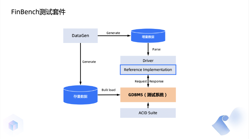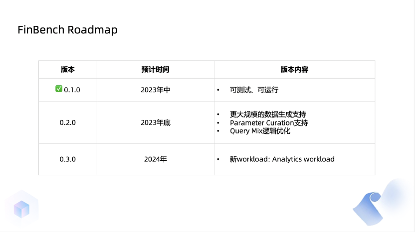在测试,我们需要测试不同的数据库,对不同的数据库进行验证。这就需要一个通用接口,所有的数据库都必须按照这个接口进行实现,以实现相同的逻辑。我们目前也提供了几个不同数据库的参考实现,其中就包含TuGraph。目前,我们的版本0.1中,数据集可以生成不同规模的数据。但目前我们只测试了不大于10GB的数据,我们正在继续增加这个范围,希望能够支持更大规模的数据集。这方面存在一个主要问题,即生成的数据必须符合实际的分布。例如,每个点之间的关联数量,这个关联分布是可以统计出来的,但在生成数据时如何保证生成的数据与该分布一致,本身就是一门学问。而且这只是一维的情况,同时每个点还需要满足其使用的设备也符合一定的规律,这个多维的分布约束更加困难。因此,目前我们仍在不断优化这一部分。目前,我们有12个相对复杂的查询和6个相对简单的查询,以及19个写查询。同时,我们还在测试中包含了ACID测试,以测试数据库本身的原子性和持久性等特性。因为作为一个金融级的系统,这些特性对其非常重要,数据不能丢失,丢失数据将是一个严重的问题。整个项目从去年二月份开始提出提案,一直持续沟通,到今年六月份启动项目,大家开始工作。然后在今年六月份,大约一年的时间开发了第一个版本。参与这个项目的有九家公司。目前,该项目已经发布了第一个版本,但像之前提到的,仍然存在许多问题需要解决。我们也意识到需要持续更新和改进,因为这种标准是随着时间不断演进的。包括之前提到的实时应用和复杂计算,我们在金融场景中经常使用。如何在这个框架下支持不同的离线应用也是未来的工作之一。FinBench这个项目是一个开源项目,这些代码和实现都是公开的。同时,我们还实现了几个不同数据库的参考实现。例如,刚才提到的大量查询和数据库实现的逻辑,因此,如果有新的数据库需要进行测试,可以参考这些实现并在此基础上进行开发。我们也欢迎更多的人来改进这个国际测试标准,并欢迎大家进行讨论。谢谢大家。