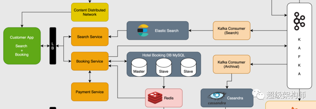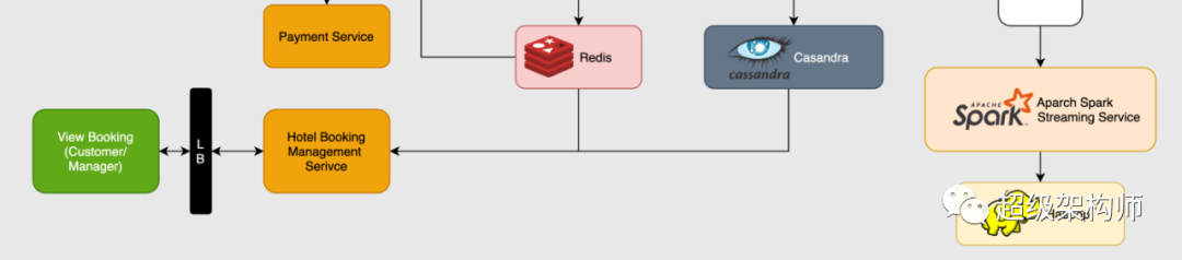 Customer/Manager 应用程序将请求发送到负载均衡器,并将请求分发到预订管理服务器。然后通过 Redis 和 Cassandra 对数据的服务请求。通过 Redis,它请求最近的数据,因为它是一个缓存服务器。这可以减少应用程序端的加载时间。
