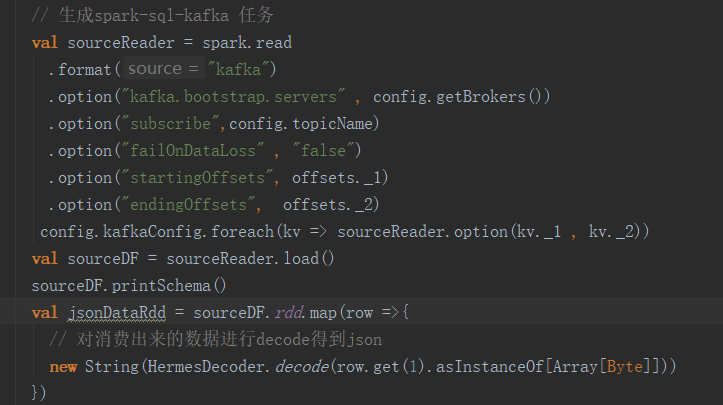因此,我们基于spark-sql-kafka开发hamal,旨在解决如上痛点并且让配置更加的简洁。实现的过程大概包括,spark-sql-kafka会根据输入的任务从Kafka各个Partition消费出payload数据,对每条payload执行解编码、解压、magic code等操作,此时会将payload数据转化成json字符串,这个json字符串可以直接作为一个字段写入到Hive表里,也可以根据事先配置提取出对应的节点和值作为列和列值写入到Hive中,甚至可以通过Json的Schema推断出Hive表结构,并将Json各节点对应写到Hive表的各列中。