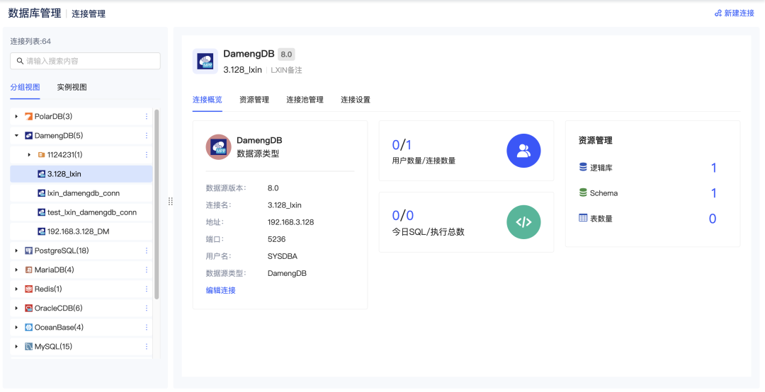 连接管理,是针对访问数据库时创建的连接进行管理。在连接管理中,我们增加了连接管控与资源纳管。