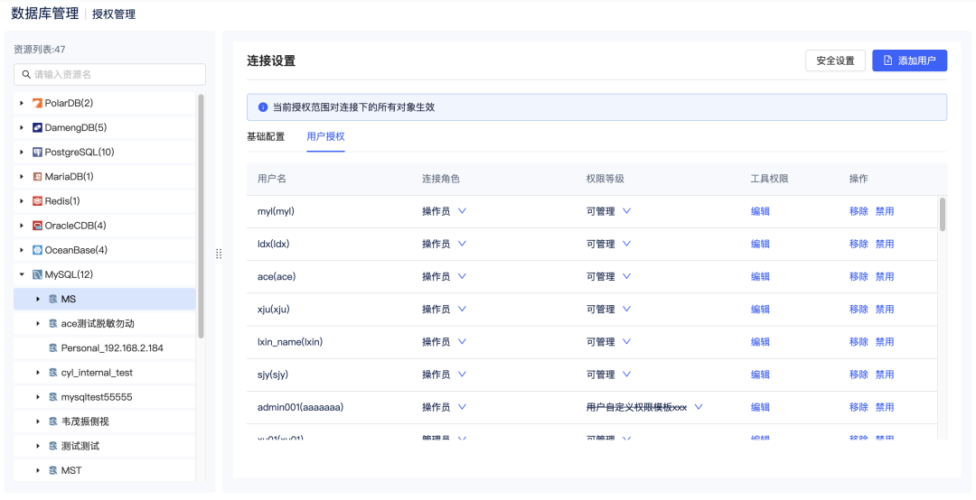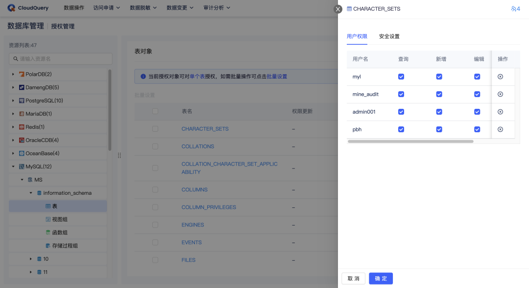 细粒度授权: 在数据库对象层级,我们可以针对用户分配不同的细粒度权限,包括查询、修改、添加、删除、导入和导出等操作权限。同时,也支持对单个用户或批量用户进行权限管理。