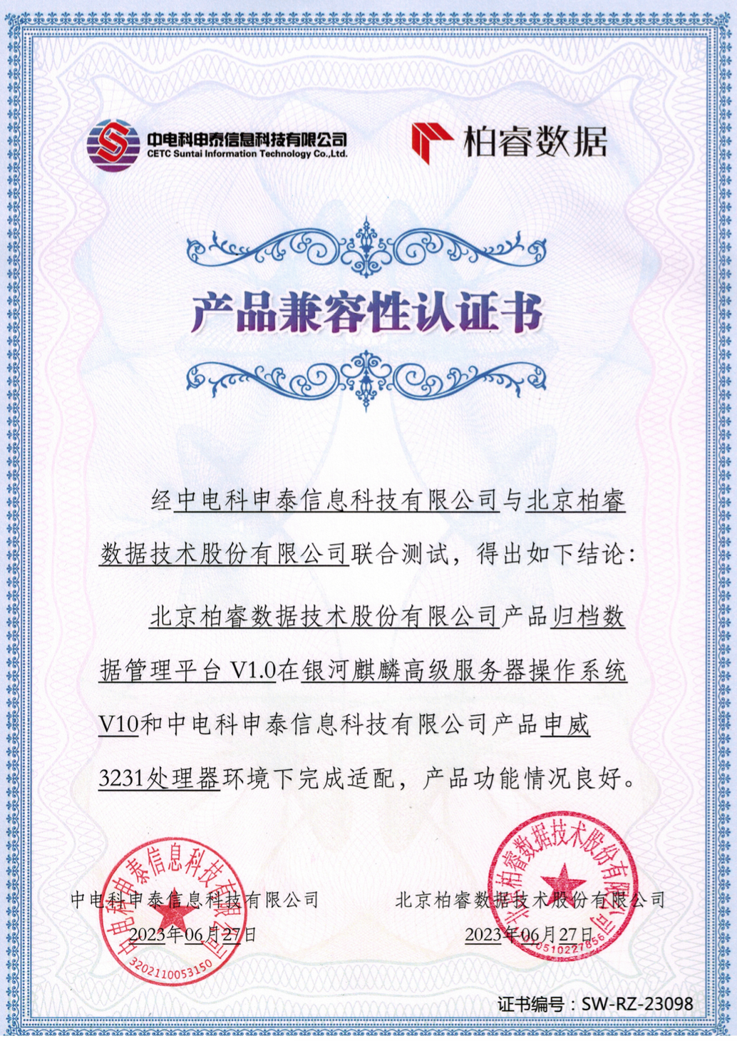近日,北京柏睿数据技术股份有限公司(简称“柏睿数据”)和中电科申泰信息科技有限公司(简称“电科申泰”)经联合性严格测试得出:柏睿流湖仓归档管理系统在银河麒麟高级服务器操作系统V10和电科申泰产品申威3231处理器环境下,产品相互兼容,功能情况良好,满足国产化安全可控要求。