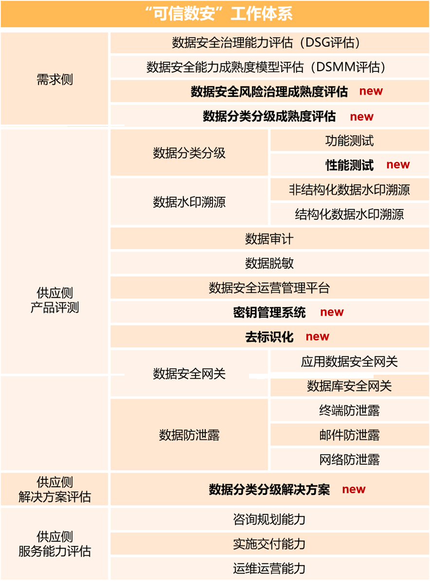 “可信数安”评估体系是一个关注数据安全行业供需发展,面向供需双侧能力要求建立的权威市场化数据安全评估体系。一方面面向需求侧开展企业级、系统级数据安全评估,协助各组织提升安全能力,实现以评促建效果;另一方面面向供应侧开展产品评测及服务能力评估,筛选优秀的产品与服务,推动技术及服务水平的进步。