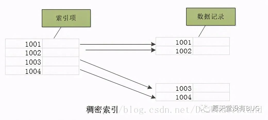 稠密索引:每个索引键值都对应有一个索引项