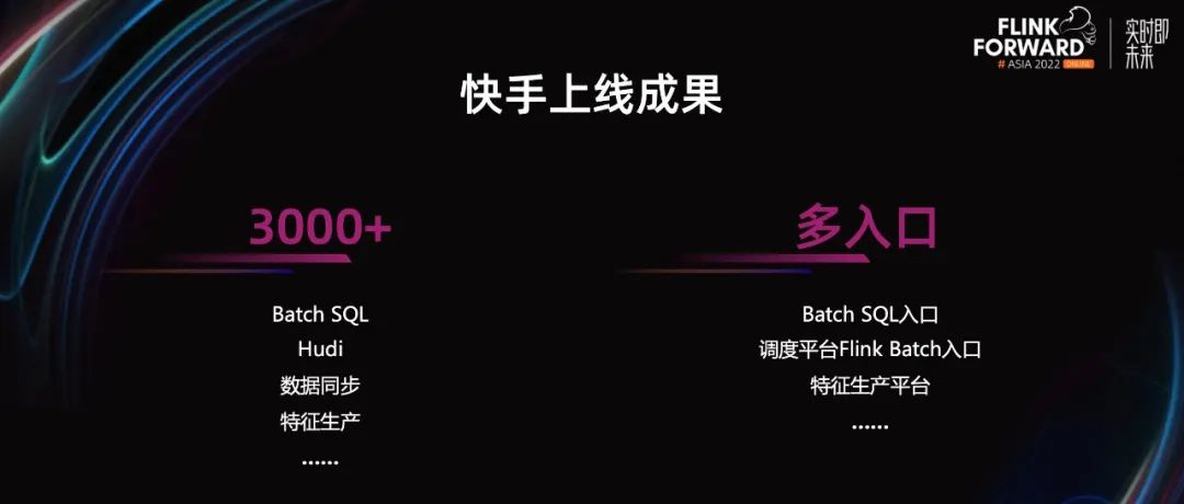 接下来,重点介绍一下 Flink Batch 生产应用的情况。目前,快手线上稳定运行了 3000+的 Flink Batch 作业,主要是平滑迁移的 Batch SQL。与此同时,快手为用户提供多种入口选择。其中,Batch SQL 入口,面向传统的离线生产开发使用 Hive 方言,也是我本次分享的重点。调度平台的 Flink Batch 入口,主要方便熟悉 Flink 的用户直接使用 Flink 方言或 API 开发 Batch 作业,并提供完整的离线调度支持。其他入口是业务方根据自己需要,基于快手平台搭建的业务系统。