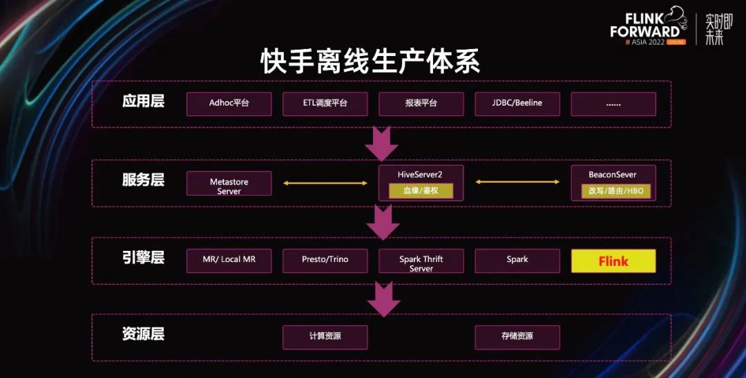 接下来,简单介绍一下快手的离线生产体系。在应用层,一般都是各种开发平台,或者是一些业务系统。在服务层,快手是使用 HiveServer 作为 Batch SQL 的统一入口,统一使用 Hive 方言。BeaconServer 可以做 SQL 的改写,引擎的路由策略,还有 HBO 优化等。下面引擎层可以自由的切换,所以我们将 Flink 接入离线生产,只需要适配 HiveServer,然后在 BeaconServer 中,加入 Flink 引擎路由规则即可。快手目前使用 SQL-Client 的方式接入 HiveServer,未来可能会扩展 SQL Gateway 的支持。