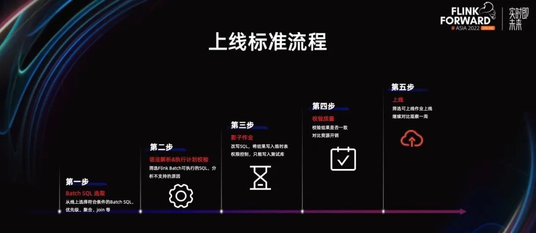 解决完如何接入离线体系的问题之后,明确下作业上线的流程。- 第一步,筛选出符合要求的 Batch SQL,比如,刚开始我们选择低优先级的简单数据处理作业。