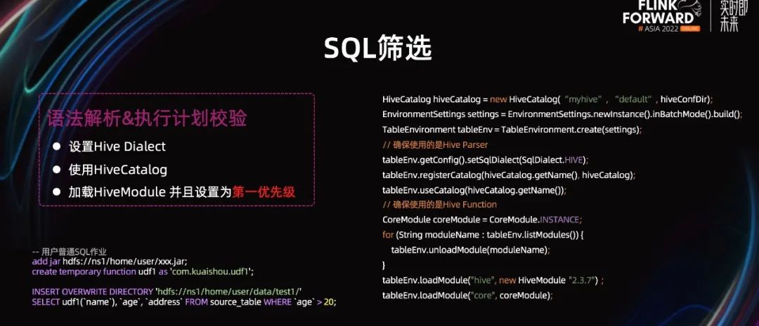 除此之外,需要确保 HiveModule 是最高优先级。这样 Flink 和 Hive 同名的 Function 才会用 Hive 的实现。如上图所示,按照右边这种方式实现之后,SQL 校验通过率提高了很多。但仍有很多 Batch 语法不支持,比如 Add Remote JAR 和 insert 目录等等。