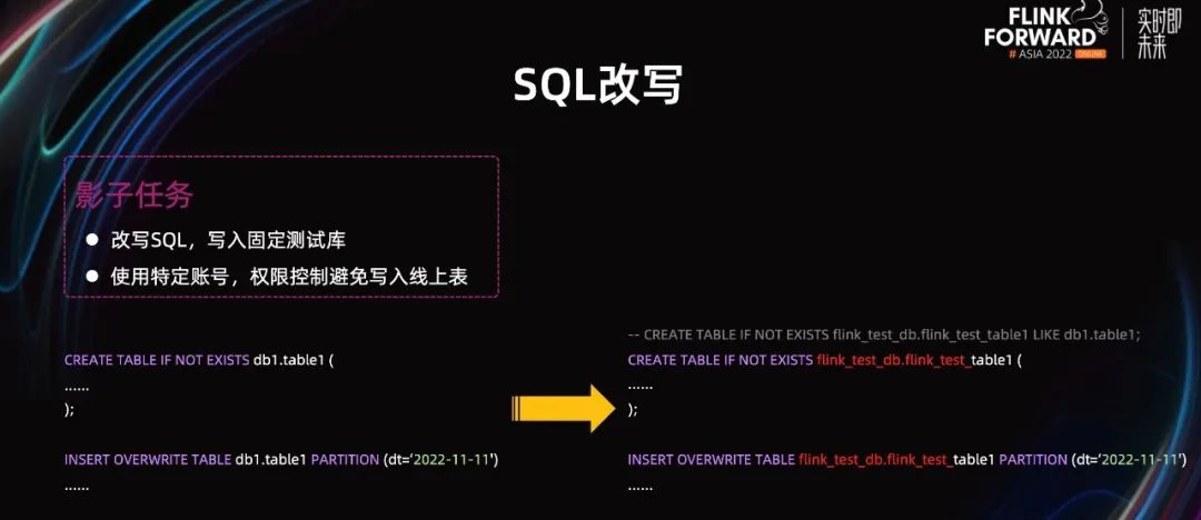 在执行影子作业时,可以使用一个小权限的账号。这个账号只有写测试库的权限,避免 SQL 改写失败把数据写入到线上库。