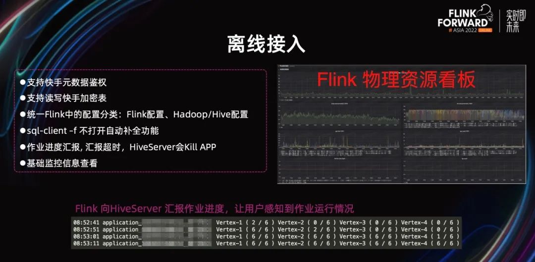 如上图所示,列出了我们做的一些修改。原来 Flink 的配置由 Flink、Hadoop、Hive 三部分组成,配置管理起来比较复杂也不够清晰。因为我们通过 HiveServer 接入,HiveServer 在启动 Flink 时,会把 Hive Session 里的配置,都传给 Flink。这里包括用户手动 set 的配置和 Hadoop 相关配置。所以,我们把 Flink 的配置改为两部分,一部分是 Flink 自己的配置,一部分是 Hadoop 和 Hive 的配置。SQL-Client 会默认会开启单词补全功能,即输入单词的一部分,然后使用 Tab 键来补全单词,这个功能在交互模式下是没问题的。但在使用文件传入 SQL 时,如果 SQL 内容中,刚好有这种情况,就会导致 SQL 发生变化,出现字段找不到的异常。所以从文件输入 SQL 时,需要关闭补全功能。作业进度汇报,是对用户体验非常重要的功能。不然作业提交后,用户无法像 Hive/Spark 那样看到进度信息,HiveServer 也不知道作业运行是否正常,可能会出现作业一直卡主的情况。所以我们做了进度汇报功能,如果长时间没有汇报进度,HiveServer 就会主动杀掉作业。最后,监控看板真很有必要。在分析问题时,可以辅助定位,不然只能盲猜。另外,在接入离线生产方面,还有一些和平台产品适配的工作。