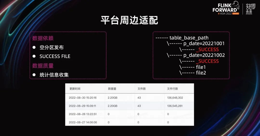 Flink 根据 Sink 写出文件目录,来判断需要发布哪些分区,动态分区情况下没有问题。如果是静态分区写入的任务,同时没有数据生成,Flink 就不会发布分区,这样就可能会导致下游不被拉起。除此之外,如果没有写出 SUCCESS FILE 的话,也会有类似的问题。在收集统计信息方面,Flink Batch 原来没有统计信息收集,当生成分区后,元数据中心显示数据为 0。用户看到之后,以为作业没有执行成功,就会重跑作业。如果用户配置了数据质量校验,没有统计信息,也会导致校验不通过。介绍完接入相关内容,我们来看一下在线上运行之后遇到的问题。