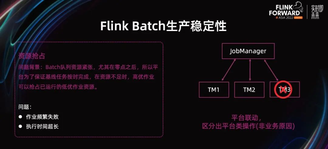 离线生产一般是 T+1。由于 0 点之后开始处理前一天的数据,所以 0 点之后,会调度起大批的作业,离线资源就会很紧张。这个时候启动的基线作业,可能就拿不到资源。为了保证基线作业按时完成,YARN 会 Kill 掉一些低优作业的 Container,把资源分给基线任务。Flink 一般会在一段时间内,当 Task 失败总次数达到阈值,作业失败。离线引擎一般是同一个 Task 失败几次,作业才会失败,并且离线引擎不会将平台原因导致的失败计算在内。Flink Batch 上线之初,就遇到了资源抢占问题。作业会出现运行一段时间就失败,触发调度平台的失败重试,重试几次才会成功。有的作业可能不会失败,但因为 Task 被删除,需要重算数据,所以执行时间被拉长。要想解决这个问题,又不能简单的把 Task 失败阈值上调。如果遇到业务逻辑导致的 Task 失败,调大失败阈值,会导致异常没有被及时发现,严重的会造成事故。因此,我们参考离线引擎的做法,在 Task Fail 时拿到具体的失败原因。如果是资源抢占或者机器下线之类的平台原因,不计入失败次数。这样就解决了 Flink 作业频繁失败重试的问题。如果用户觉得运行时间过长,就需要考虑调整作业优先级。