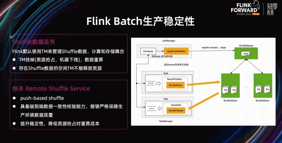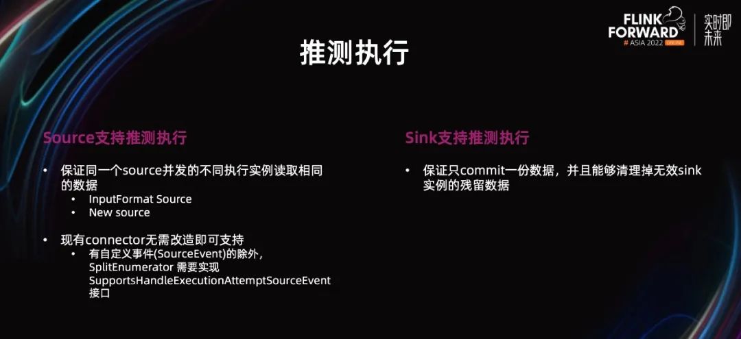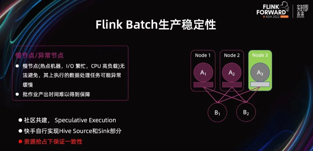 大体上来说,就是在框架层加入了一个缓存,来记录各个 Source 并发已经获取到的数据分片,以及其下的所有执行实例已经处理到的分片信息。对于 Sink 端,由于只是负责写数据,情况则简单很多,只需要保证影子任务和慢任务,最终那个先执行完,就提交那个的数据,同时清理掉另外一个无效 Sink 的数据,避免数据重复。通过推测执行功能,保证了 Batch 任务执行的稳定,产出时间相对稳定可控,保障了 Flink Batch 在快手生产使用过程中的整体稳定性,为进一步的 Batch 落地打下了良好基础。以上就是从能用、好用、生产稳定可用等三个方面,介绍了社区和快手合作在 Batch 方面做的一些核心优化改进工作。这些工作保证了 Flink Batch 在快手的上线,并在生产环境中稳定运行。随着快手在 Batch 的进一步推进,未来还会有诸多方面的工作要做。