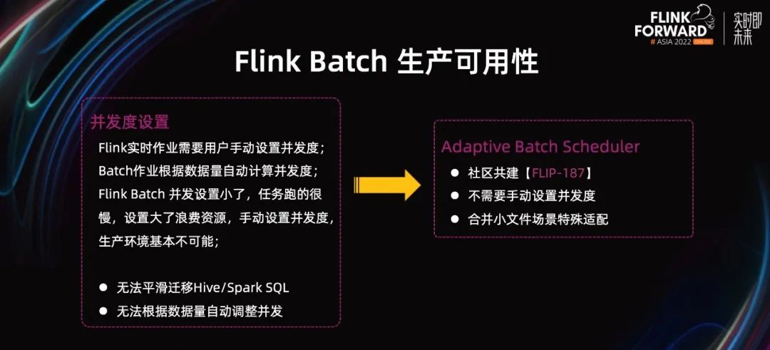 随着迁移作业量的增长,面临一个很棘手的问题,设置的默认并发度对大部分作业来说都不是最优的。在实时计算场景,作业并发度都是用户自己设置的。但对离线计算来说,用户不需要设置并发度,引擎会根据数据量自动计算出对应的并发度。对我们来说,手动设置并发度是不现实的。由于数据量每天都在变化,不能每天都用同样的并发。如果需要手动设置并发度,就无法实现平滑迁移 Hive/Spark 作业的目标。这个问题是我们和社区共建解决的,Adaptive Scheduler 根据数据量自动预估合适的并发度,这样我们就无需修改用户作业,实现平滑迁移。除此之外,合并小文件的并发度 Adaptive Scheduler 暂时不能准确预估,我们通过 Hack 的方式临时解决,后续社区也会针对这种特殊 case 扩展 API 支持。