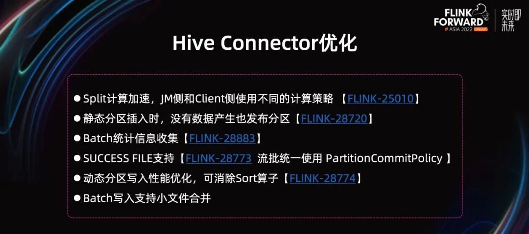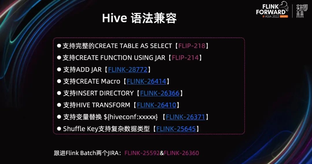 Flink Batch 在快手落地上线的过程中遇到了诸多问题,包括语法兼容、Hive Connector、稳定性等多个方面。针对这些问题,快手和社区一起合作,共同解决这些问题,成功推进了 Flink Batch 的上线。接下来,给大家介绍一下社区从能用、好用、稳定可用等多个方面做的优化改进工作。由于 Flink 是标准的 ANSI SQL,Hive SQL 与 ANSI SQL 语法差异较多。为了让 Hive SQL 平迁到 Flink SQL 引擎上,快手选择了使用 Hive Dialect。这样的话,绝大部分的作业都可以迁移,不需要用户修改 SQL。虽然在 Flink 1.16 版本之前,社区在 Hive Dialect 兼容上,已经做了很多工作。但离完全兼容 Hive SQL,仍有差距。快手选定了一批准备迁移的作业后,通过解析验证,发现诸多不支持的语法。在快手给出 input 后,社区第一优先级做出了支持。如上图所示,我们列出了比较重要且很常用的一些语法,比如 CTAS、ADD JAR、USING JAR、宏命令、Transform 等。UDF 在 Hive SQL 会经常使用的,用户一般会先在作业中 Add 一个远程的 UDF JAR,然后注册并使用。在 Flink 中,当前不支持 Add JAR,导致很多作业都无法迁移。除此之外,算法同学不喜欢写 Java UDF,他们一般用 python 写脚本,然后通过 transform 来处理数据。通过补全 Hive Dialect 语法,解决了迁移过程中的第一个 block。成功保证了现有的 Hive SQL,能跑在 Flink 引擎上。社区在 Flink 1.16 版本做了大量工作,补全 Hive 语法。目前,通过 qtest 测试下来,整体兼容度能达到 95%,基本能保证用户现有的 Query 都能迁到 Flink 上来。Flink-25592&Flink-26360,这两个 umbrella issue 在追踪 Flink Batch 相关的工作。由于 CTAS&USING JAR 这两个功能,涉及到 PUBLIC API 的改动,在社区有对应的 FLIP 设计文档,因此接下来我会详细介绍一下这块的设计。