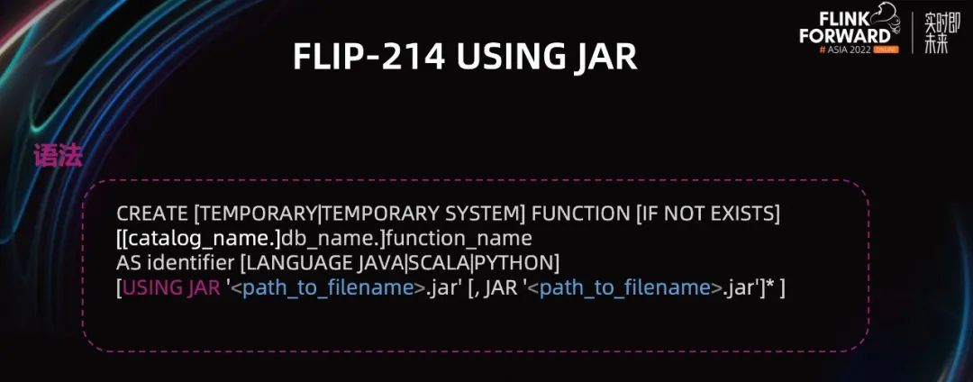 如上图所示,先介绍一下 FLIP-214 Create Function using JAR 功能。由于这个功能涉及到 SQL 模块的 ClassLoader 的改动。因此,有必要给大家介绍一下设计思路,避免大家踩一些 ClassLoader 的坑。写 SQL 的人都知道,由于业务逻辑五花八门,计算引擎内置的函数往往不能满足需求。在此种情况下,需要用户手写 UDF 满足需求,尤其是 Java 技术栈的大数据引擎。我们会把 UDF 打到 JAR 包里,然后上传到某个远程的 HDFS 地址上,在使用的时候先 Add JAR 或者直接基于 JAR 包创建 UDF。考虑到该场景以及快手的业务需求,社区在 1.16 支持了 USING JAR 功能。整体的语法部分如 PPT 中红色部分标出的字体,相比于之前,多了 USING JAR 的关键字,并且允许指定 JAR 包的地址,该地址可以是远程的,也可以是 Local 的。目前我们仅 Java&Scala 语言支持该语法。