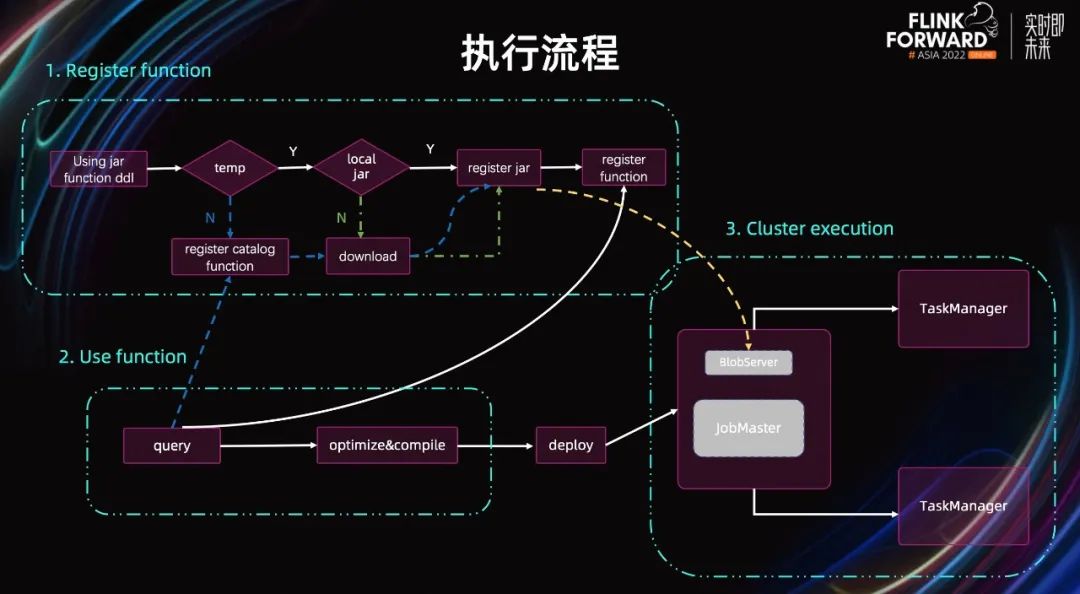 接下来,详细介绍一下如何使用 USING JAR 这个功能,以及其执行机制。首先,注册 UDF,在注册 UDF 的过程中,我们会解析 UDF 的 DDL,先判断函数是否是 temporary。如果不是,则直接注册到 Catalog 中,不做任何其他额外的工作。如果是 temporary,我们会接着判断 JAR 包的地址,是本地文件,还是远程的 HDFS、OSS 地址。如果是 Local JAR,则会校验 JAR 包是否合法,如果 JAR 包合法,会把 JAR 包地址添加到 ResourceManager 中,同时也添加到 MutableURLClassLoader 中。这里需要额外的说明一下,为了解决 Flink Table 模块中经常出现的 Connector&Catalog 相关的 ClassLoader 问题。1.16 版本社区在 Table 模块引入了一个 MutableURLClassLoader,每个 TableEnvironment 持有一个该 ClassLoader,允许动态的添加 JAR 包到 ClassLoader 中,这就解决了动态加载 JAR 包的问题。接下来会把该 JAR 包注册到 FunctionCatalog 中管理。如果 JAR 包是远程的地址,会多一步下载的动作,这个动作由 ResourceManager 来完成,把 JAR 包下载到本地的临时目录,同时加载到 MutableURLClassLoader 中。第二步是使用 UDF,如果在作业的 Query 中使用了 UDF,在 Query 解析优化的过程中,会先判断该 Function 是 temporary 的还是持久化的。如果是后者,会从 Catalog 中拿出其 JAR 地址信息,先把 JAR 包下载到本地,并加载到 ClassLoader 中,接着进行 Query 的优化,并生成 JobGraph。生成 JobGraph 之后,第三步则是要把作业部署到集群上运行。我们在 Query 优化的时候需要 JAR 包,同时在集群上运行的时候也需要这些 JAR 包,否则作业运行时就会出现 ClassNotFoundException。那我们是怎么做的呢?这里我们利用了 Flink 的 BlobServer,在往集群上提交作业时,我们会先把 ResourceManager 中维护的所有的本地 JAR 包,上传到 Flink JobManager 的 BlobServer 中,也就是图中黄色虚线标出的部分;在作业执行时,由 TM 负责从 BlobServer 中拉取这些 JAR 包。