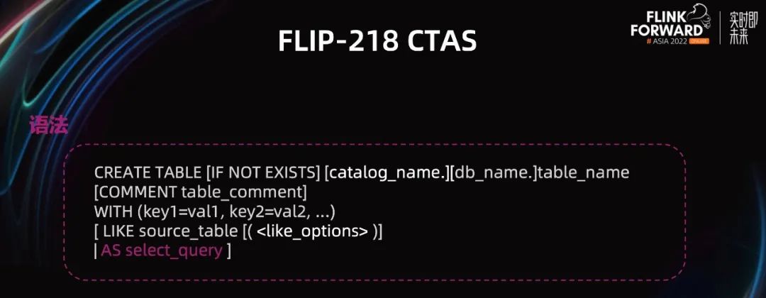 接下来,我们介绍另一个比较常用的功能 CTAS。这个语法在所有大数据计算引擎中都支持,相比 CREATE TABLE 语法,其不同的地方在于文本中红色标出的字体。该语法的作用是,由引擎基于 SELECT Query 自动推断出目标表的 Schema,并由 Catalog 负责创建;其等效于先创建目标表,再写一个 insert into...select query,其最大的好处是在 Query 比较复杂的时候,避免了用户手写目标表的 DDL,简化了用户的工作量,这个功能在生产环境中是非常有用的。