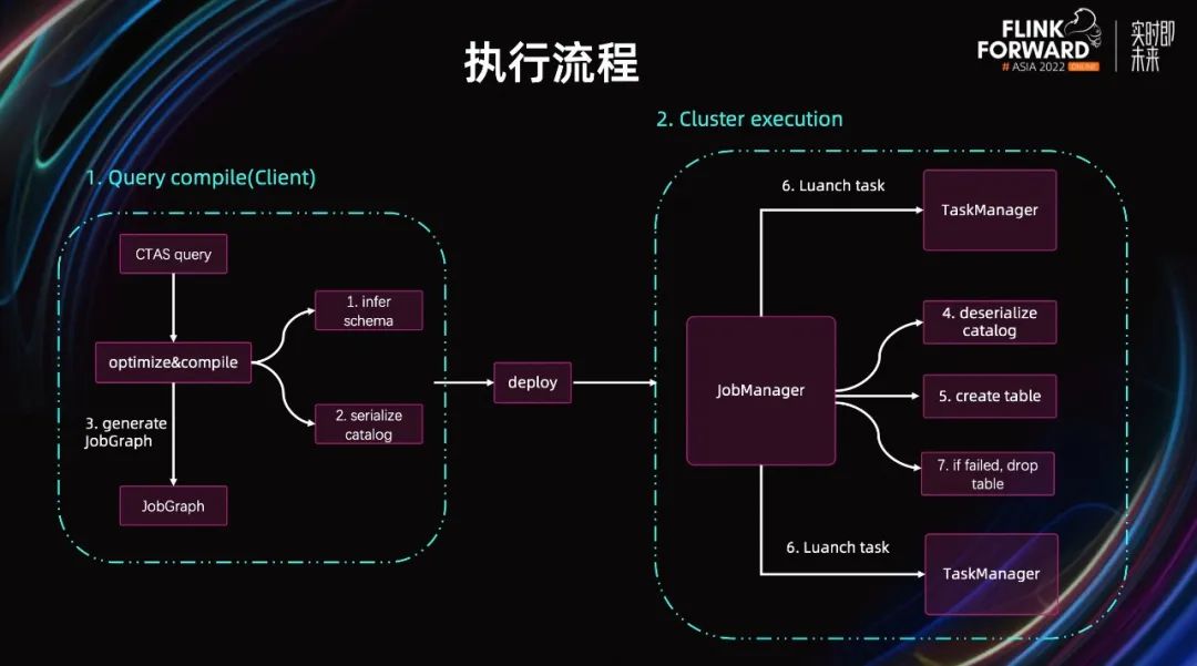 下面介绍一下 CTAS 整体的执行流程。首先,用户写了一个 CTAS Query,在客户端编译优化的过程中,我们会先基于 Query 推导出目标表的 Schema。然后,把对应的 Catalog 序列化。序列化的目的是,为了在 JobManager 上能反序列化,执行建表的动作。同时,我们生成一个钩子对象,由这个钩子在 JobManager 负责调用 Catalog 创建目标表。第二步就是作业的执行。在作业开始调度前,我们首先在 JobManager 上把钩子对象及 Catalog 对象反序列化回来。接着,由钩子调用 Catalog 先创建目标表。然后,调度作业。假设作业最终成功执行,则没有额外的动作。如果作业执行失败,或者被手动取消,出于原则性的考虑,我们会通过钩子调用 Catalog 把创建的目标表给 Drop 掉,保证最终没有对外部系统产生副作用。考虑到 Flink 是一个流批一体的计算引擎,CTAS 语法在流批两种场景都能使用。但一般在流场景下,作业失败时,我们不会手动删除表,而是靠外部系统的更新能力,保证数据的最终一致性。因此,我们引入了一个原子性相关的 option 由用户来决定是否需要保证数据的原子性。社区在 Flink 1.16 版本只完成了 CTAS 的一个基本功能,还没有支持原子性,这个会在 1.17 完成,更多细节大家可以去看 FLIP-218 的设计文档。