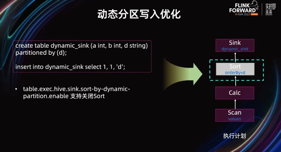 不同于静态分区的写入,总是需要用户指定分区列的值。动态分区允许用户在写入数据的时候,不指定分区列的值。比如,有这样一个分区表:用户可以使用如下的 SQL 语句向该分区表写入数据。在该 SQL 语句中,用户没有指定分区列的值,这就是一个典型的动态分区写入的例子。在 Flink 中,对应生成的 plan 是什么呢?如右边执行计划图所示,这里会有四个节点。其中,值得注意的是灰色的 Sort 节点。Flink 在动态分区写入时,会把数据按照动态分区列先做一个排序,然后再一个一个分区的写入数据。这样带来了一些好处,但也导致作业的执行时间变的更长。因此,针对该现状和快手的业务场景,我们引入了一个选项,在写入动态分区时,允许用户手动关闭 Sort 节点,避免额外的排序,加快下游数据的产出速度。