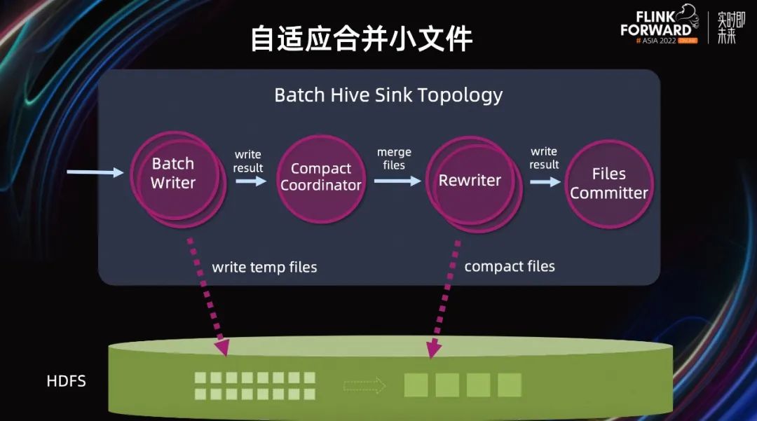 小文件问题在生产环境中也是一个很常见的问题。在写入 Hive 表的时候,为了保证写入的速度,作业的并发设置较大。虽然加快了写入速度,但也引入了小文件问题。小文件会增加 HDFS NameNode 压力和 RPC 压力,对下游的读取任务不友好。除此之外,在动态分区写入时,某个并发可能会同时写很多动态分区,导致大量的小文件。基于上述问题,我们在 Hive Batch 写入,支持了自适应合并小文件。上图是 Batch 模式下,Hive Sink 支持小文件合并的拓扑。我们看到图中有四个节点,分别是 Writer、CompactorCoordinator、Rewriter 和 PartitionCommitter。这里的核心是 CompactorCoordinator 和 Rewriter。CompactorCoordinator 是单并发节点,上游的 Writer 写完文件后,把文件路径信息告诉 CompactorCoordinator。CompactorCoordinator 拿到上游的所有文件后,判断哪些文件是小文件,需要合并成的目标文件大小,从而决定把哪些小文件合并成一个目标大文件。然后把这些信息告诉给 Rewriter,由 Rewriter 来完成合并的工作,最后由 PartitionCommitter 提交分区信息。自适应合并小文件带来的收益是减少文件数量,降低 HDFS 的压力;提高用户作业的数据读取效率;加快执行速度。