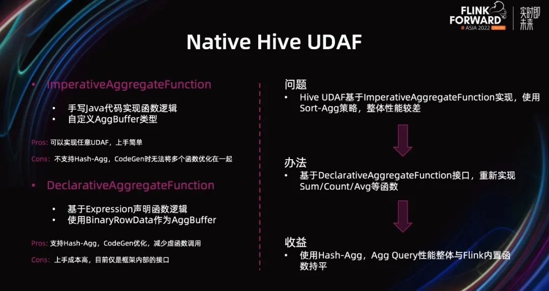 在使用 UDAF 过程中遇到的性能方面的问题。首先,我先来介绍一下 Sort-Agg 和 Hash-Agg 这两个概念。一般在聚合计算场景,有两种策略,分别是 Sort-Agg 和 Hash-Agg。Sort-Agg 是在聚合计算之前,根据 group by key,对数据进行全局排序。排序之后,遍历所有数据,遇到相同 key 的数据,就做累加操作。如果遇到不同 key 的数据,意味着上一个 group 的所有数据已经计算完,可以直接往下游发送结果。然后,接着计算新 key 对应的 group 的聚合值。Hash-Agg 则是指,在内存中构建一个 Hash 表,key 是 group by 的 key,value 是每个 group 的聚合值,一直往上累加。当所有数据遍历完,则最终结果才可输出。一般来说 Hash-Agg 在内存中完成,比较高效,而 Sort-Agg 需要一步外部排序,因此性能相对而言会差。当前在 Flink 中存在两种聚合计算函数接口,分别是 ImperativeAggregateFunction 和 DeclarativeAggregateFunction。上图左边列举了这两种接口的对应的 UDAF 实现的优缺点。Hive UDAF 当前只能走 Sort-Agg 策略,整体性能比较差。针对这个问题,经过调研之后,我们决定基于 DeclarativeAggregateFunction 接口,在 Flink 里重新实现 Hive 的一些常用的 UDAF。这里的难点是要做到与 Hive 的行为保持一致。重新实现之后,绝大部分的 Query 都可以使用 Hash-Agg,整体上达到了与内置函数一样的性能。