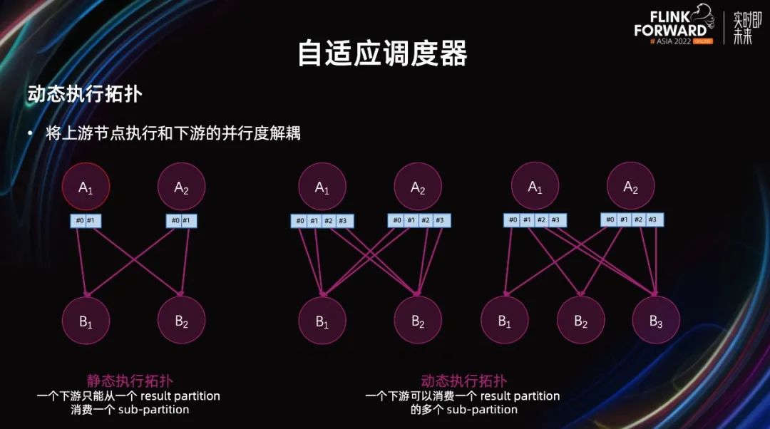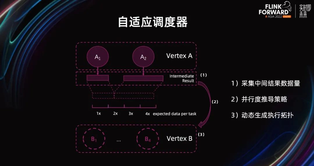 另一个比较重要的功能自适应调度器。写过 Flink 流作业的用户都知道,Flink 作业在上线前都需要设置并发度。对流作业而言,这是一个大家默认接受的事情。但对于批作业而言,情况就复杂很多。首先,批作业数量很多,动辄成百上千,乃至数万,用户不可能 case by case 的调并发,费时费力。其次,数据量每日都有可能变化,难以预估。因此,同一个并发度设置对同一个作业,不一定一直适用。无法保证作业的运行时间一直在一个稳定的时间基线范围内,对生产的影响会比较大。最后,SQL 作业,除了 Source 和 Sink 外,只能配置全局统一的并行度,没法进行细粒度并行度设置,也会遇到资源浪费和额外开销的问题。为了解决这些问题,社区为 Flink 引入了自适应批处理调度器。通过它框架会根据计算节点需要处理的数据量,自动推导节点的并行度。这样的并行度配置比较通用,可以适用于大部分作业,无需为每个作业单独配置。自动设置的并行度,能够适配每天不同的数据量。同时,由于在运行时可以采集,各个节点实际需要处理的数据量,所以能够进行细粒度的并行度设置。它的流程大致如下: