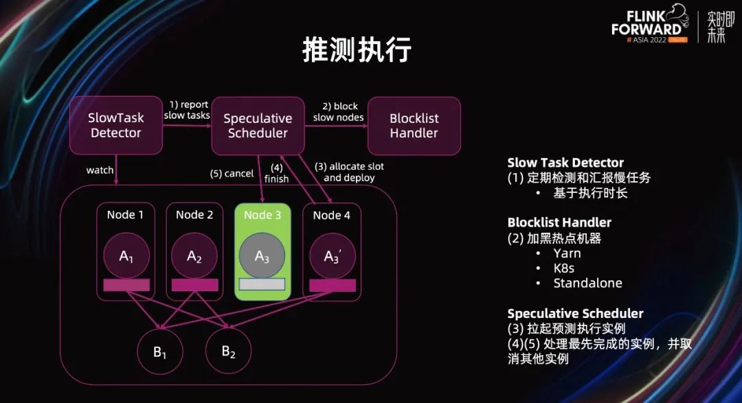 下面介绍下社区和快手合作在生产稳定性方面,做的一个比较重要的功能推测执行。在生产环境中,热点机器一般都是无法避免的,集群混部、密集回刷数据,都可能导致一台机器的负载变高、IO 繁忙,使得上面运行的 Flink 作业异常缓慢。一些偶发的机器异常,也会导致同样的问题。这些缓慢的任务会影响整个作业的执行时间,使得作业的产出基线无法得到保障。而推测执行,是一种已经得到普遍的认可、用来解决这类问题的方法。因此社区在 Flink 1.16 版本中引入了这套机制。开启推测执行后,当框架发现批作业中出现某个 SubTask,明显比其他 SubTask 执行缓慢时,会为其拉起新的执行实例。我们把它叫做影子 Task,部署在正常的机器节点上,而原本的慢任务实例会被保留继续执行。这些影子任务和对应的原始任务,具有相同的输入和产出。其中,最先完成的任务会被认可,产出的数据可以用来被下游节点消费;其他对应的实例会被取消,产出的数据会被清除。推测执行的具体流程如图所示,当 SlowTaskDetector 发现存在慢任务时,会通知给推测执行调度器。调度器会把慢任务所在机器识别为热点机器,将其加入黑名单中。然后,如果慢任务的运行中的执行实例数尚未达到上限,调度器就会为其创建新的执行实例,并进行部署。当任意执行实例成功结束后,调度器会取消该实例对应执行节点的其他所有执行实例。
